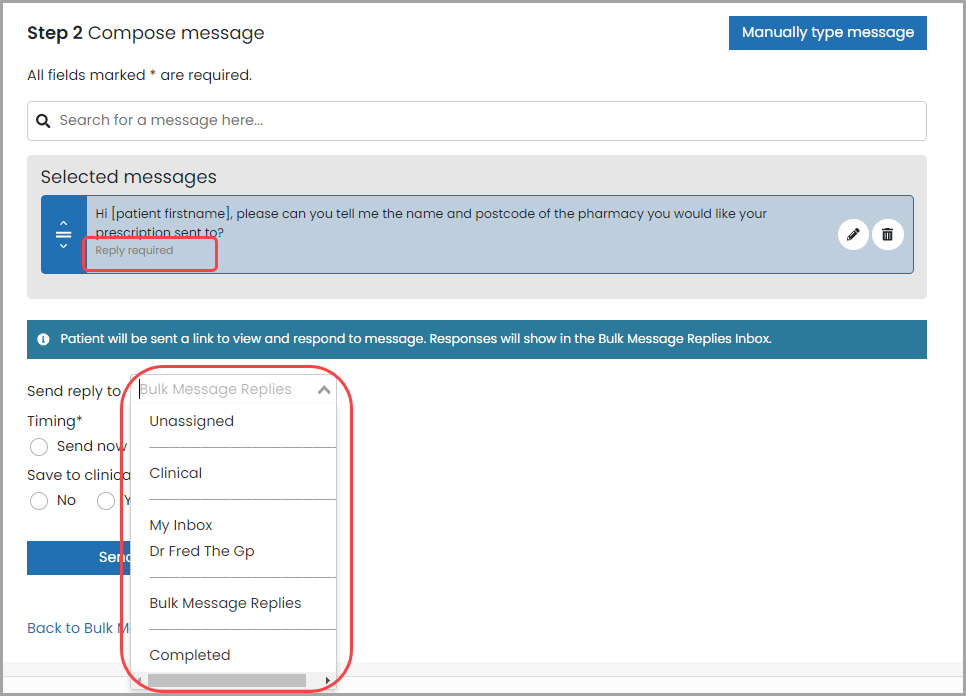 When sending bulk or individual messages, you can now choose which inbox patient responses will be sent to (for reply required messages):