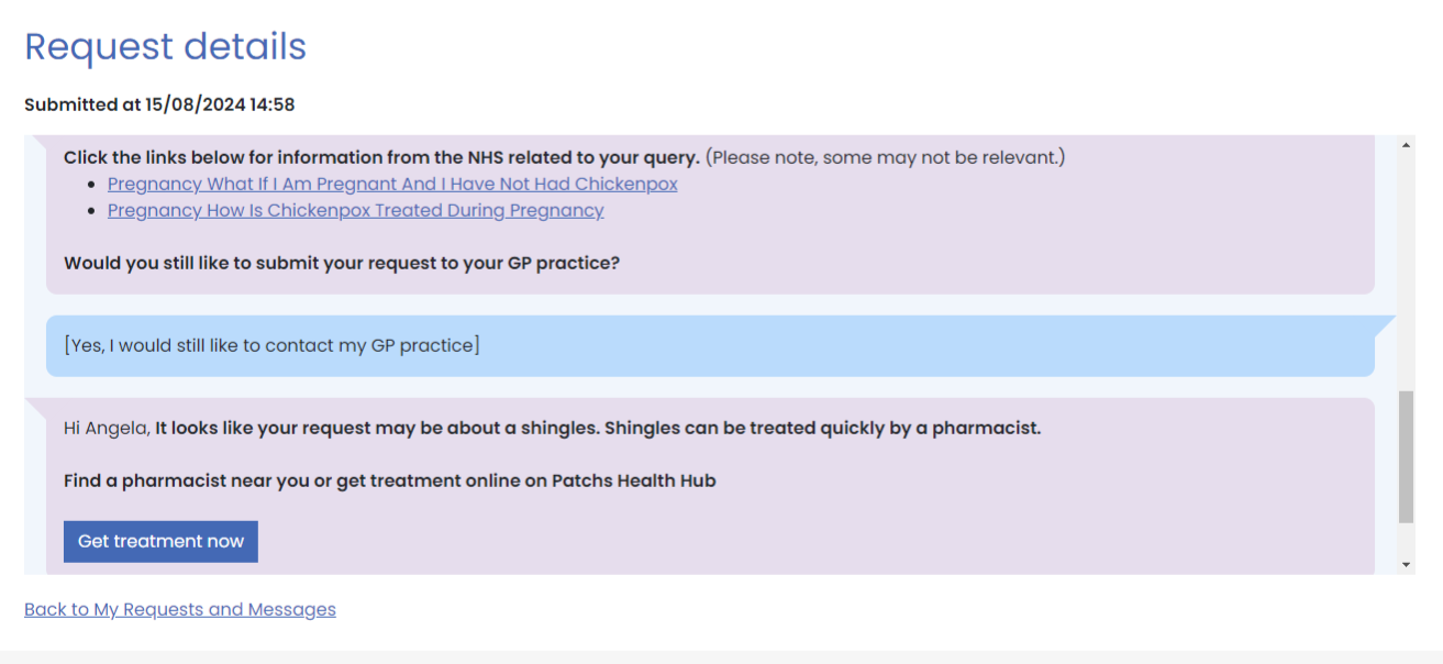 Patients can self-direct to the Pharmacy First service before contacting the practice. This feature is especially beneficial when the practice is closed or all Patchs slots are full for the day.