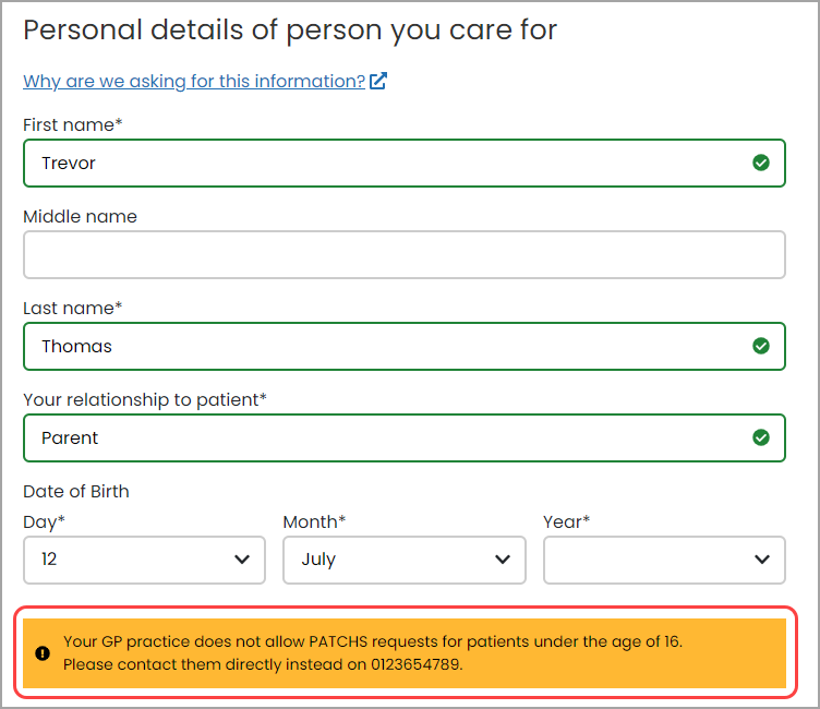 On the personal details page, the carer user will be advised  that the practice does not accept requests from patients under the age of 16 and to contact the practice directly instead.