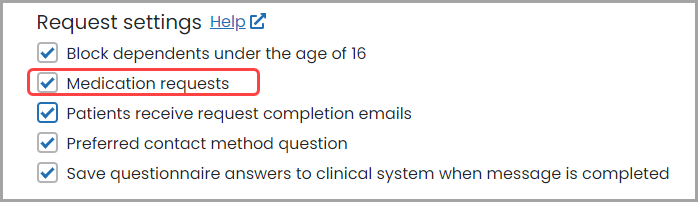 You may want patients to request medication via another system, rather than through Patchs. If that's the case, you have the option to disable the medication request option.