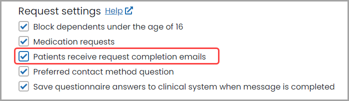 By default, patients receive emails when you complete their request. You may not want this to happen, for example if you work in an eHub where the patient requests may get passed onto another GP practice. If that's the case you can disable sending patients completion emails.