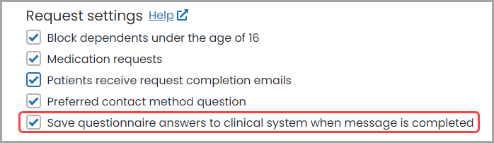 If  'Save questionnaire answers to clinical system when message is completed’  enabled, then questionnaire answers will be saved to the clinical system when you Complete message & save to clinical system.