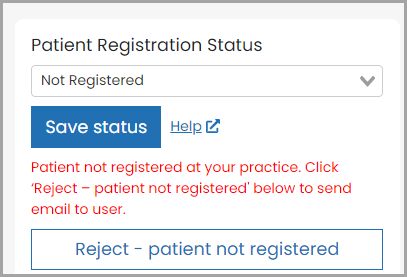 - If the patient is not registered at your practice you should update their registration status to Patient Not Registered. Then click the 'Rejected - Patient Not Registered' button, to advise the carer by email that you cannot respond to their request because the patient is not registered at the practice.