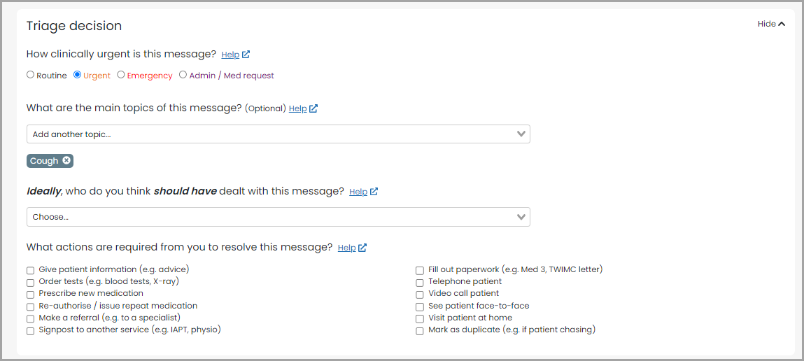 Having verified the patient details and confirmed their registration status you should add an urgency status by answering the 'How clinical urgent is this message?' in the 'Triage decision' section.